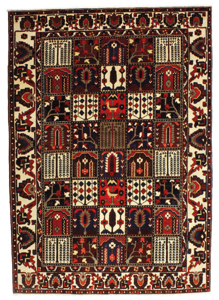 Die Muster sind von floralen Motiven geprägt und haben sich über die Jahre kaum verändert. In letzter Zeit haben Bakhtiar-Teppiche mit einem charakteristischen Medaillon in der Mitte stark an Beliebtheit gewonnen. Ihr Musteraufbau ist zwar immer sehr ähnlich, dennoch lässt die Struktur der Muster Rückschlüsse auf dessen Herkunft zu. Die Zentralmedaillons und auch die mal kräftiger und mal zarter gewählten Farben variieren von Ort zu Ort. Ein weiteres Muster ist das aus der Safawidenzeit stammende Garten- oder Feldermuster. Sommerhäuser, Weinranken, Blumen oder Bäumen erstrecken sich, von Wassergräben durchzogen, in quadratischen oder rechteckigen Feldern über den gesamten Teppich. Der Bakhtiar ist ein außergewöhnlicher Blickfang, denn es werden die für den Iran typischen Gartenanlagen aus der Vogelperspektive dargestellt.