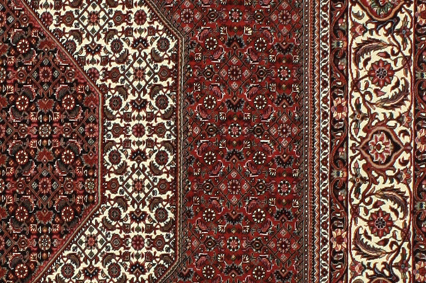 Typisch für den Bidjar ist das Herati-Muster – welches an zwei Fische erinnert, die um einen Teich herum schwimmen (daher auch die Bezeichnung „Mahi“). Eingebettet ist es meist in mehrere übereinander liegende Rauten. Die Knüpfer arbeiten dafür keinesfalls nach Vorlagen. Das Muster entsteht Knoten für Knoten völlig freihändig – eine seltene Gabe, die in die Wiege gelegt und über Generationen weitervererbt wird.