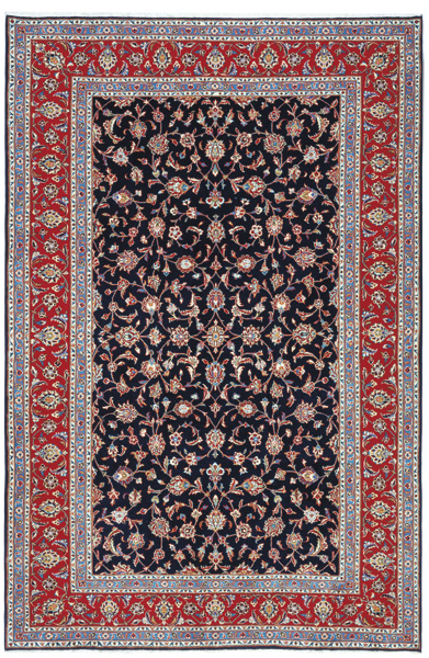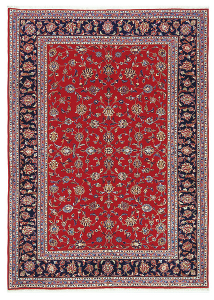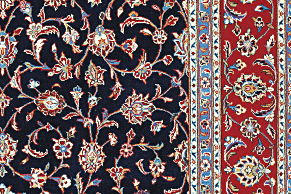 Die Kashan-Teppiche wirken sehr elegant. Ihre ausgewogenen Muster in floraler Ornamentik und dezenter Farbfülle aus warmem Rot und Blau sind bei Europäern sehr beliebt. Auch Varianten mit hellem Grund und blauer Kontrastfarbe sind üblich.