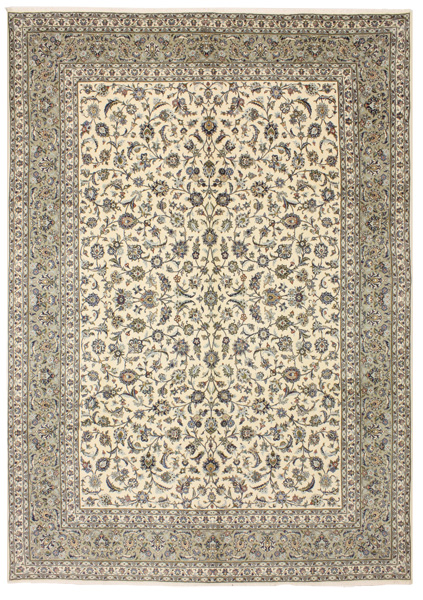 Verschlungene Blumenraken oder Jagdszenen umgeben häufig ein diamantenförmiges Medaillon. Auch die Ecken sind reich verziert. Durchgemusterte Strukturen sind bei den Kashans eine Besonderheit, denn sie sind für das Kashan-Gebiet eher selten. Normalerweise überwiegen die Medaillon-Muster. Die Farben und auch die Musterungen sind bei den durchgemusterten Varianten ebenfalls im traditionellen Kashan-Stil gehalten. Alleine aufgrund der Nachfrage aus Europa nach aufgeschlossenen Mustern werden diese Kashans hergestellt – aber nur in sehr kleinen Mengen, was diese Teppiche so außergewöhnlich macht.