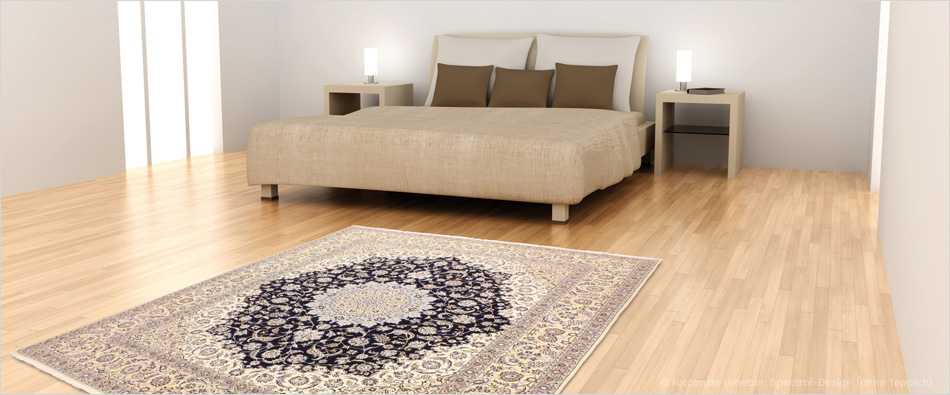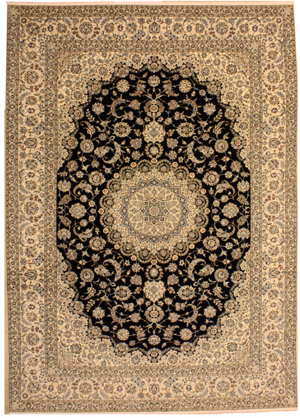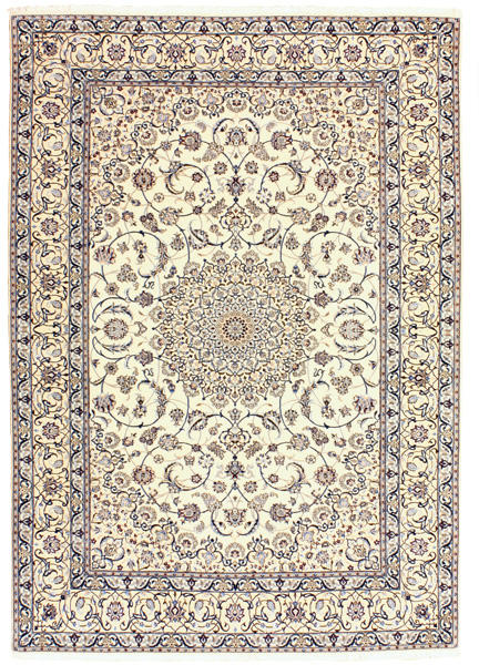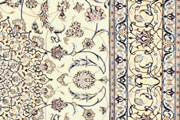 Mittig findet sich immer ein kreisrundes Medaillon, die Musterung zeigt eher florale Motive mit Blüten und Ranken – ähnlich denen der Isfahan-Teppiche. Zur Verstärkung der Konturen wird häufig Seide verwendet. In Nain liebt man die Tradition: Neue Muster werden selten entworfen, jedoch passen die Hersteller ihre Farbtöne an, damit die Teppiche moderner wirken. Nain 6La werden oft als Brücken gefertigt. Diese sind sehr teuer, weil ihre Musterung filigraner ausfällt als die der großen Teppiche.